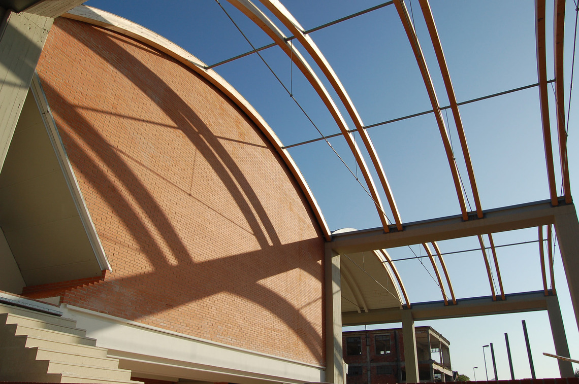 The design reuses the existing vertical structures, inserts large-span horizontal slabs, redesigns the vaulted roofs with glulam ribs, and offers a compact longitudinal façade that recedes at the north and south ends, exposing the original steel frame and dematerializing the mass.