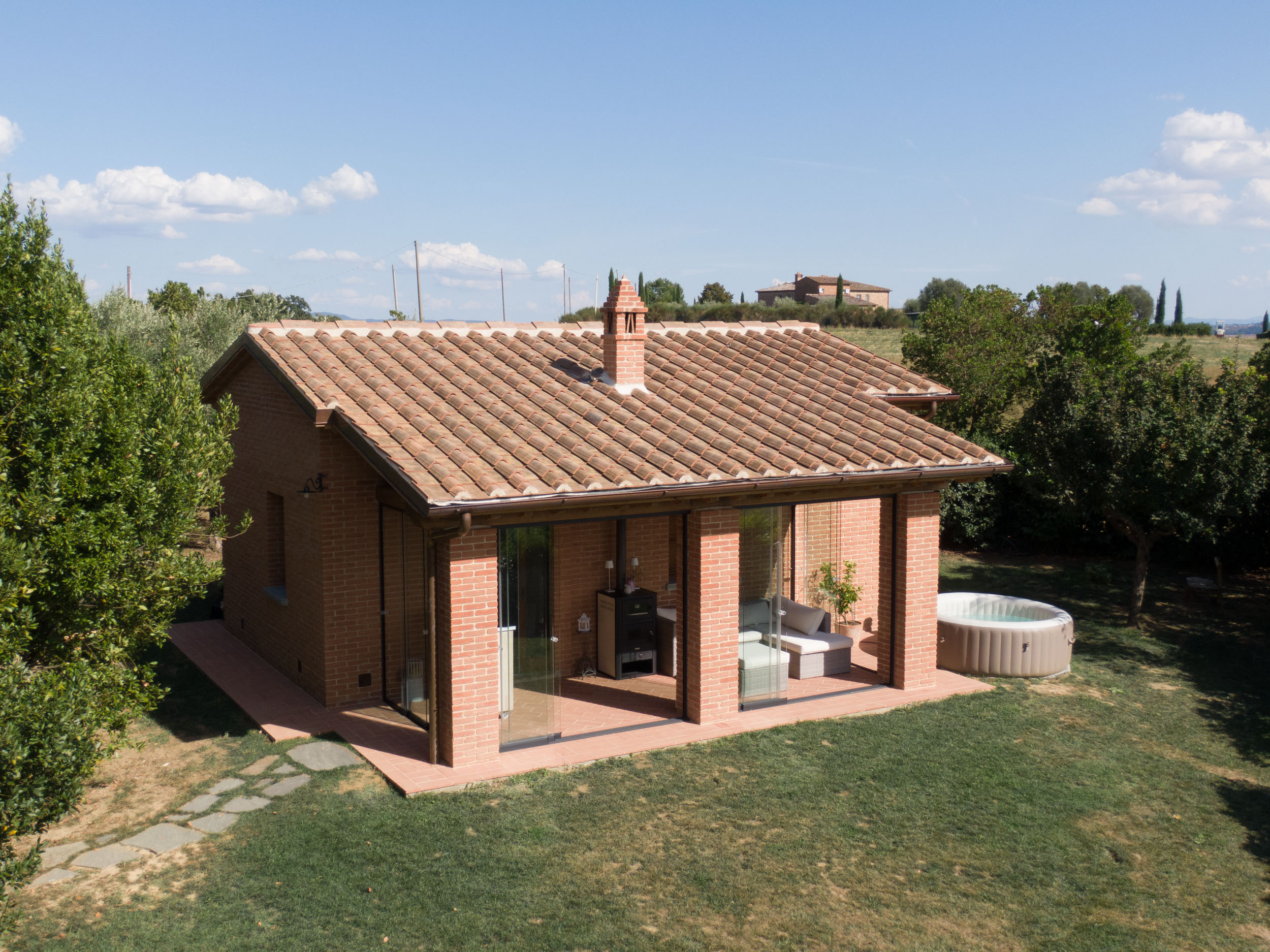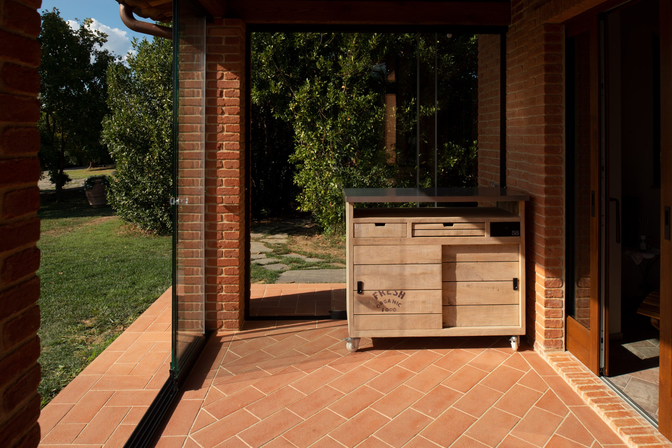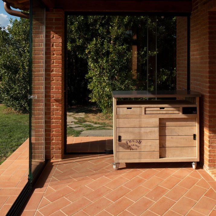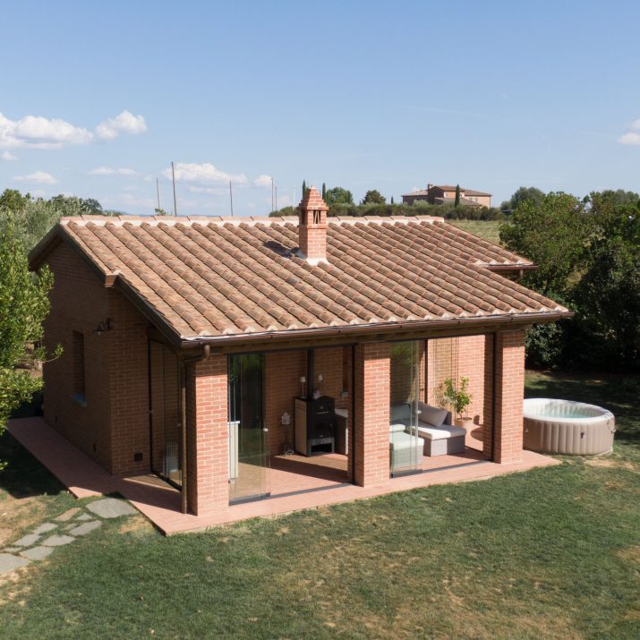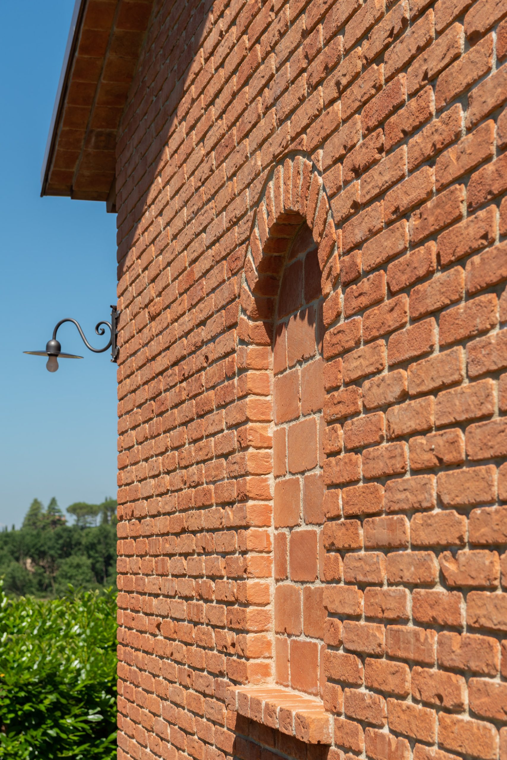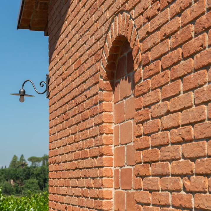 The tumbled bricks, with their irregular and weathered surfaces, were used to enhance the masonry elements with a natural, timeless effect. The Riserva Roman roof tiles completed the project, giving the structure a sober and harmonious elegance that perfectly matches the Tuscan landscape.