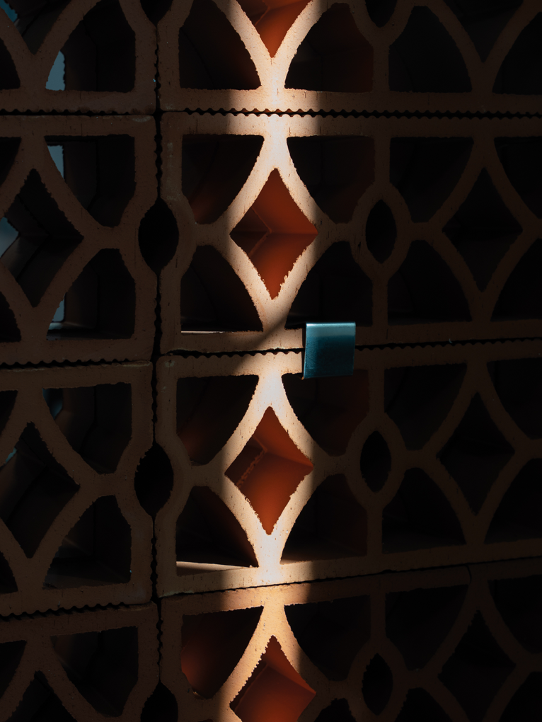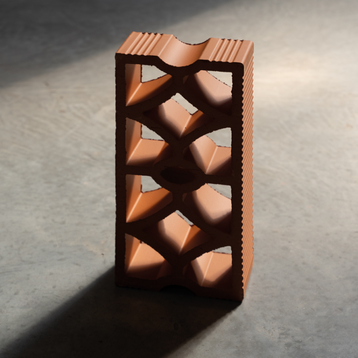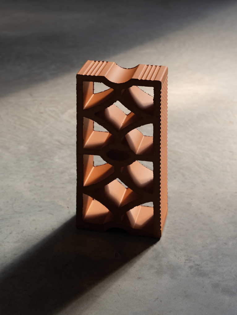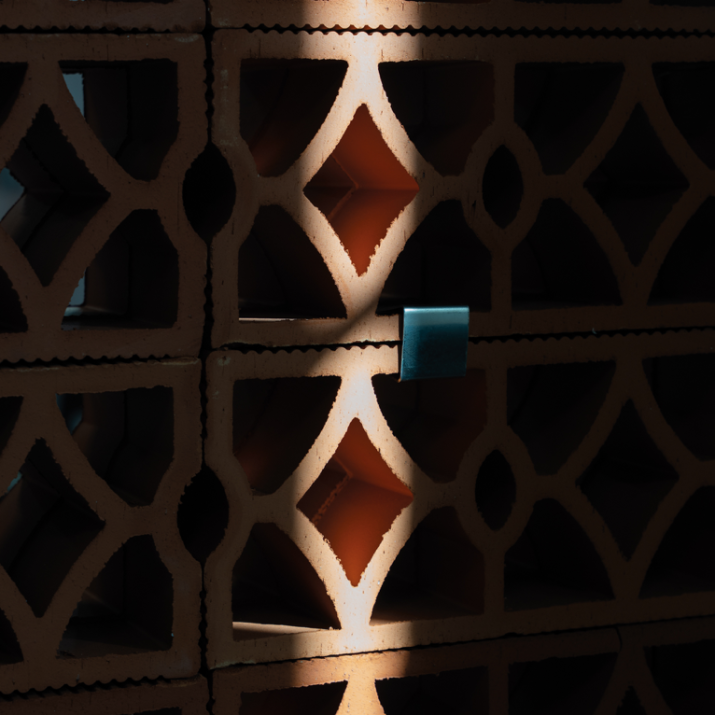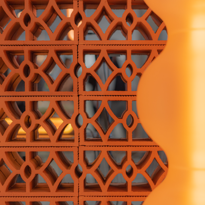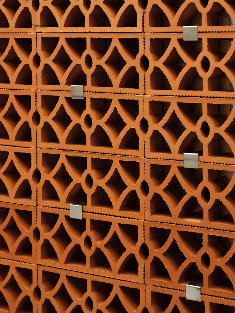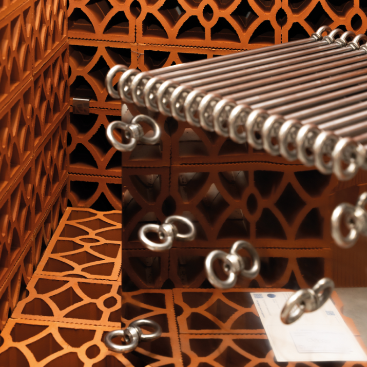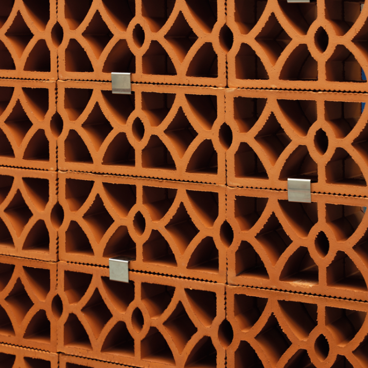 Elemento modulare con disegno intrecciato che combina permeabilità visiva e rigidità formale. Adatto alla realizzazione di schermature continue, setti decorativi e pareti ombreggianti a forte impatto materico.