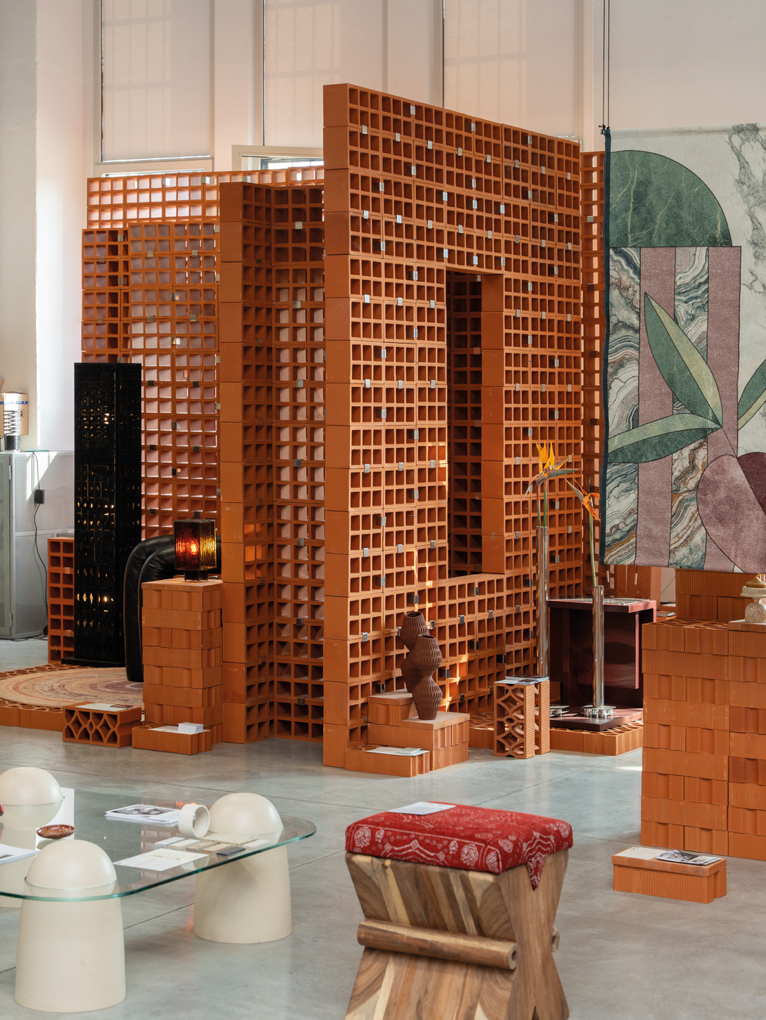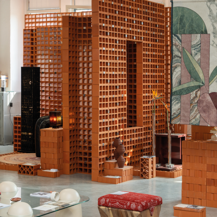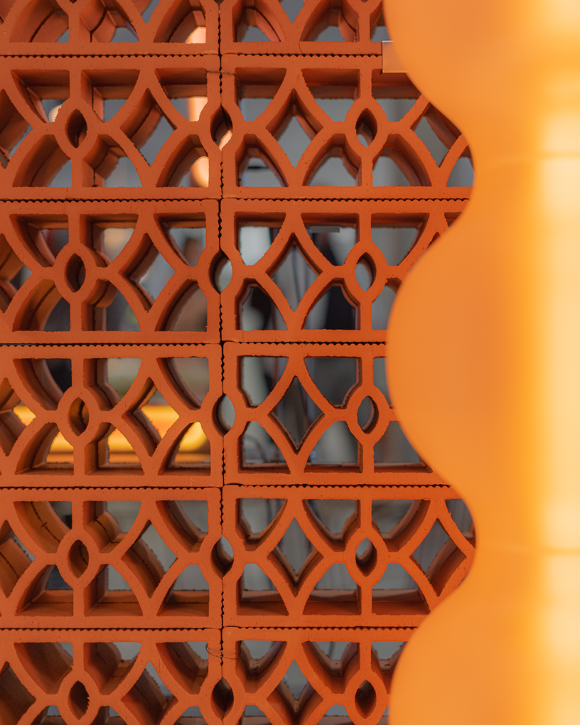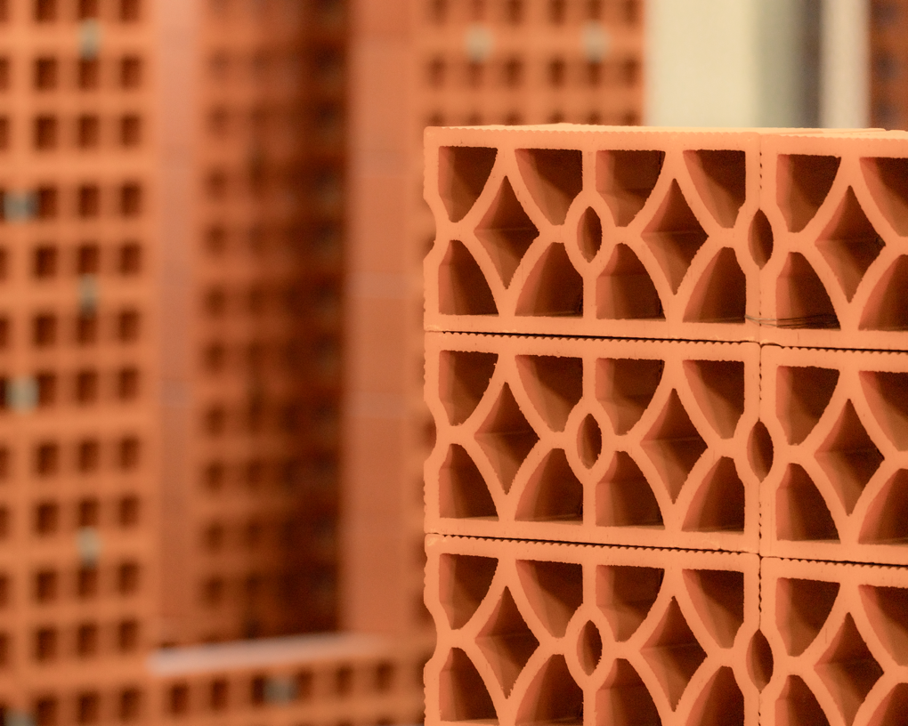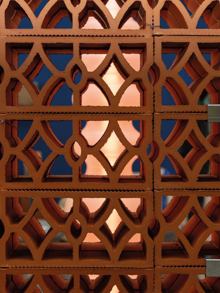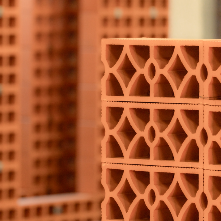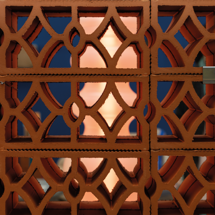 Elemento modulare con disegno intrecciato che combina permeabilità visiva e rigidità formale. Adatto alla realizzazione di schermature continue, setti decorativi e pareti ombreggianti a forte impatto materico.
