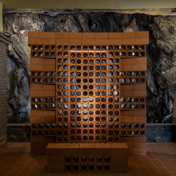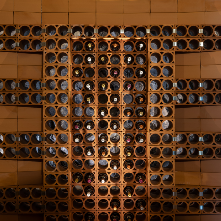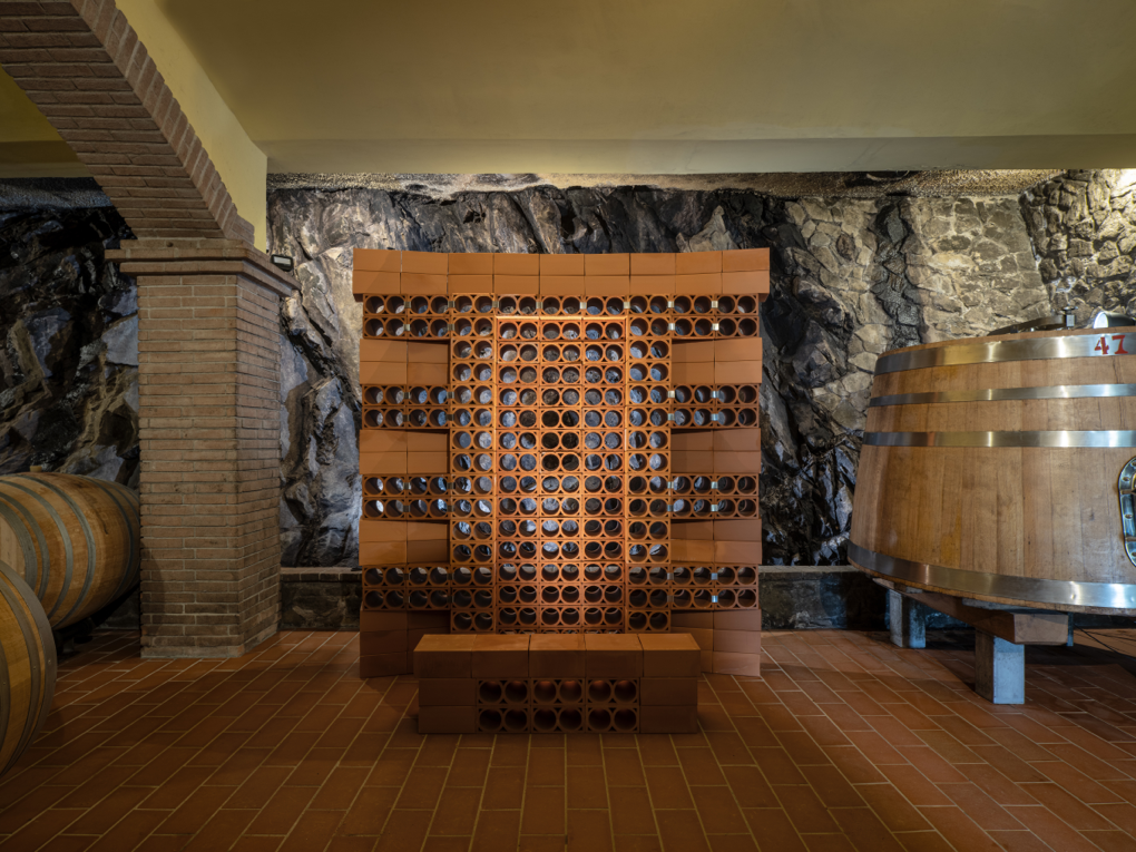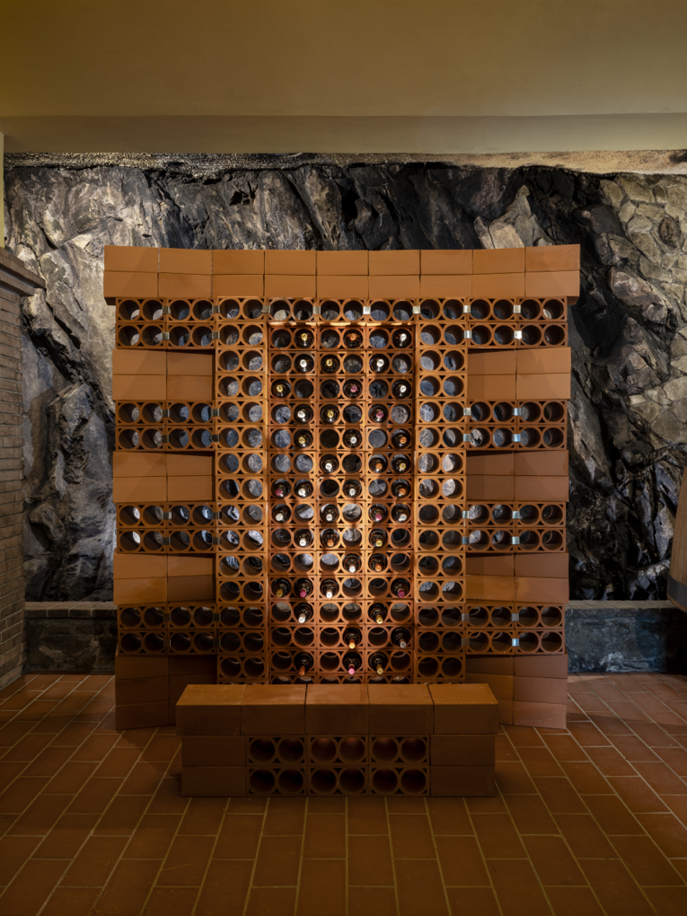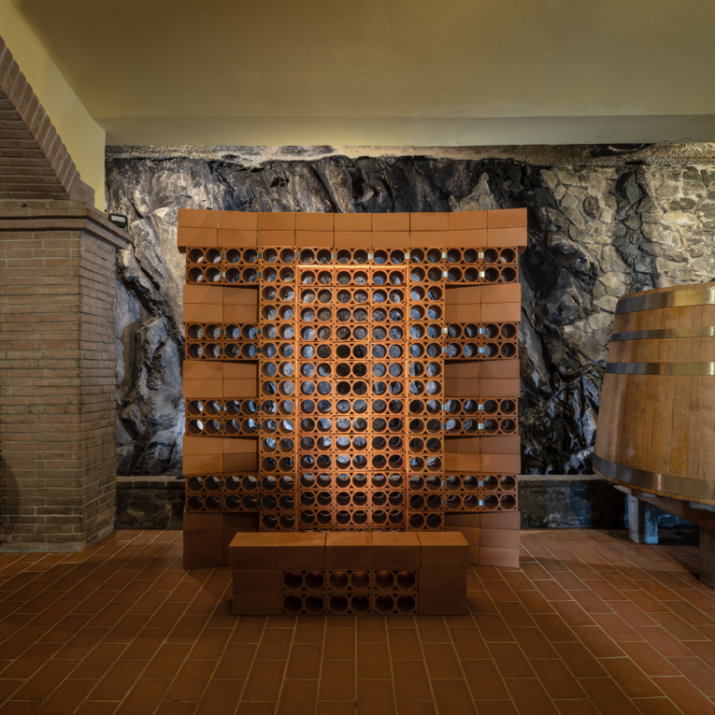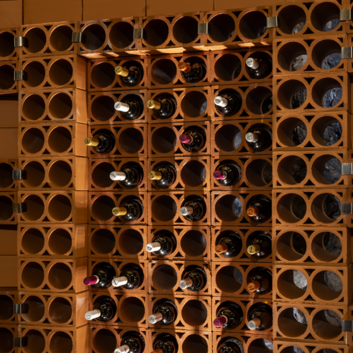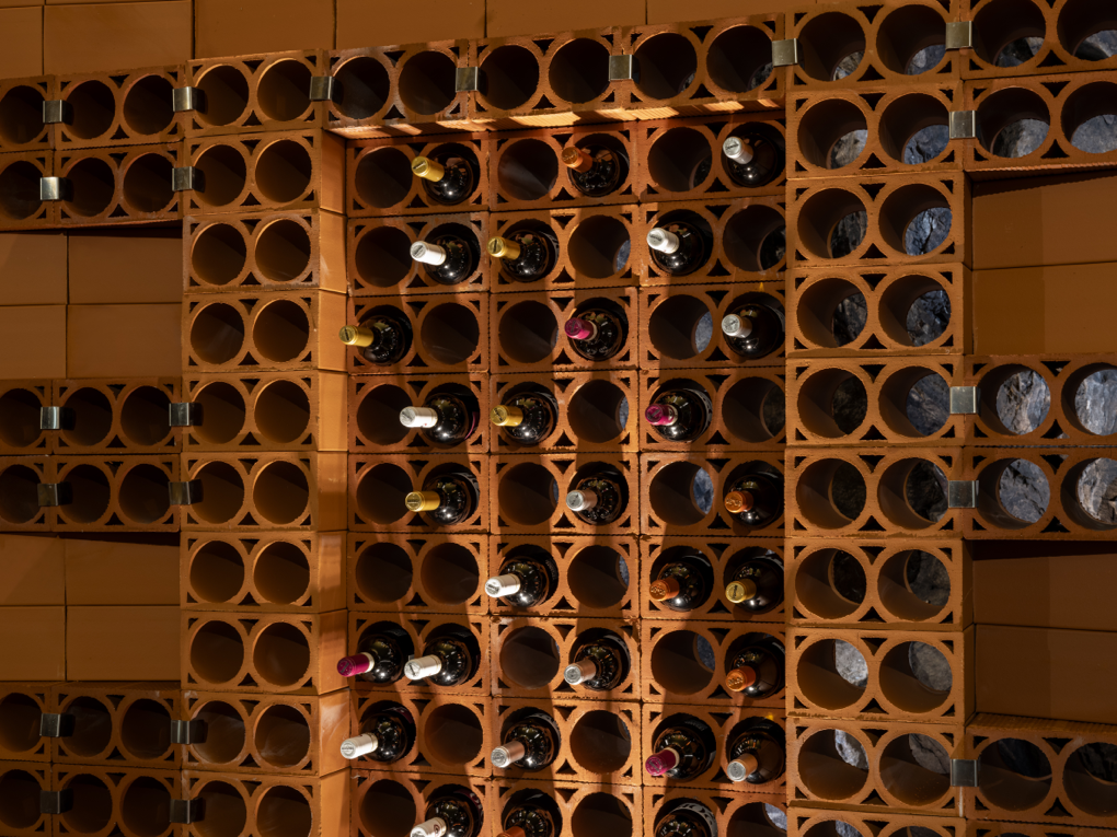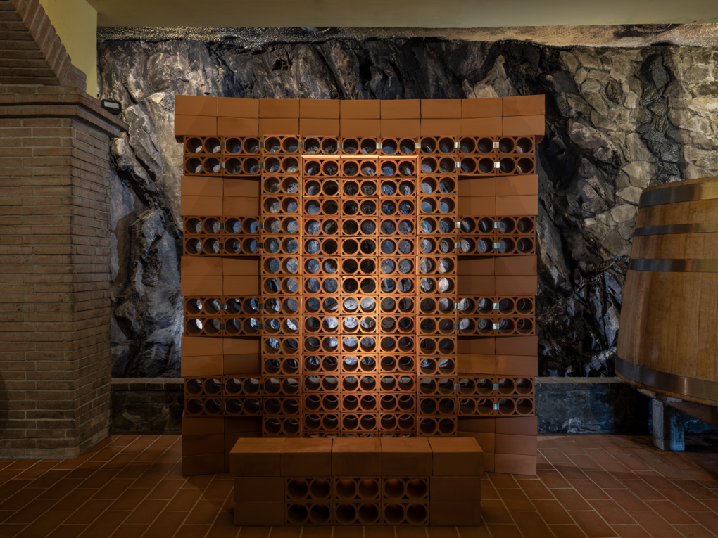 Modulo in terracotta con fori circolari passanti, utilizzabile come frangisole o come elemento contenitivo. La geometria ritmata combina funzionalità estetica e architettonica, adattandosi sia a spazi residenziali che hospitality. Il portabottiglie è pensato per contenere bottiglie di vino, ideale per cantine o aree dedicate alla conservazione del vino.