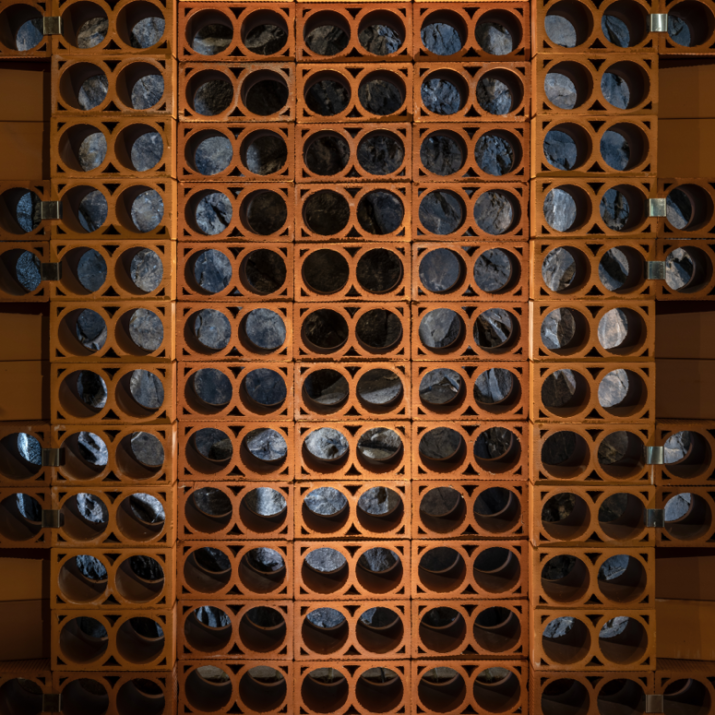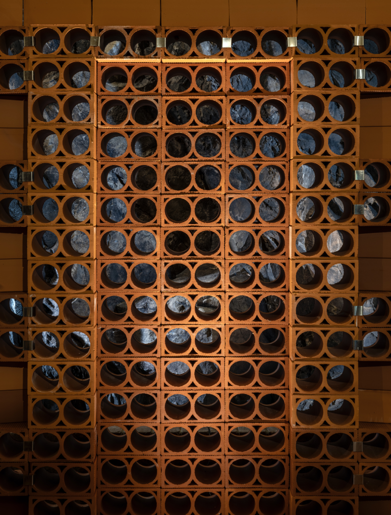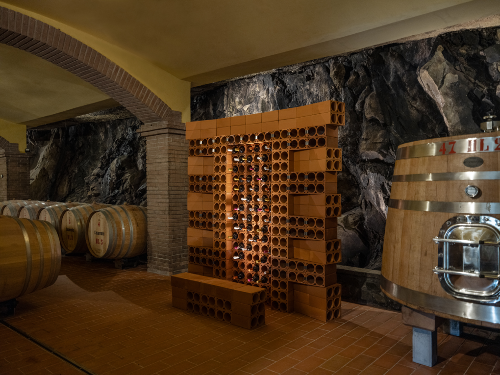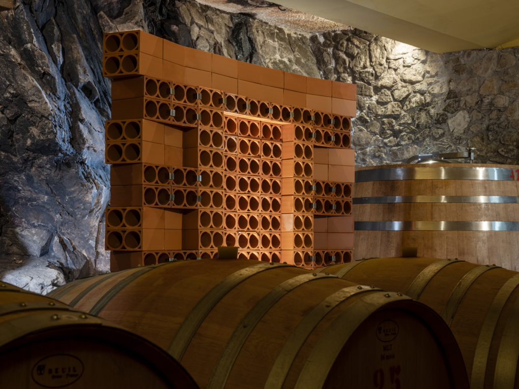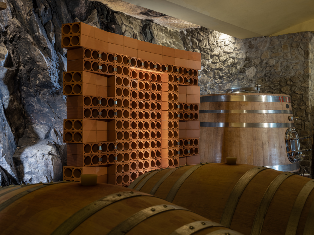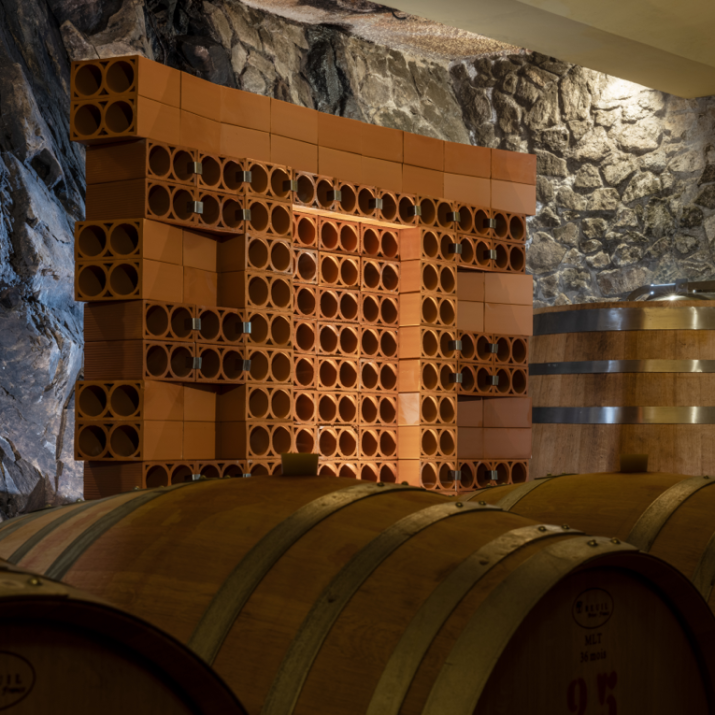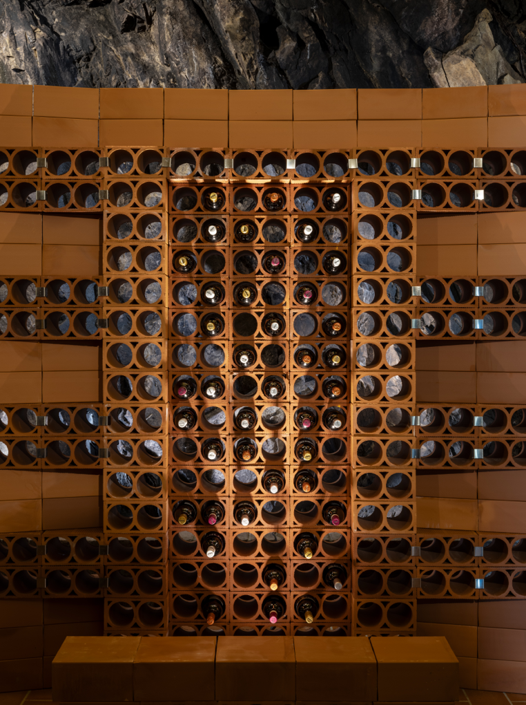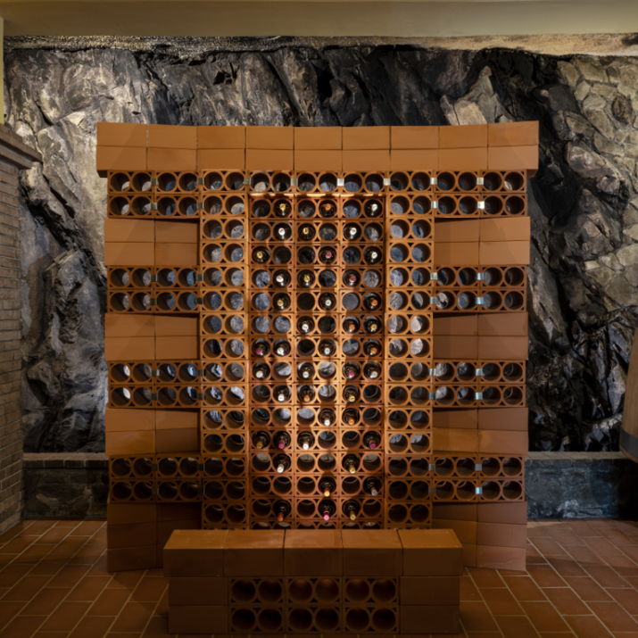Modulo in terracotta con fori circolari passanti, utilizzabile come frangisole o come elemento contenitivo. La geometria ritmata combina funzionalità estetica e architettonica, adattandosi sia a spazi residenziali che hospitality. Il portabottiglie è pensato per contenere bottiglie di vino, ideale per cantine o aree dedicate alla conservazione del vino.