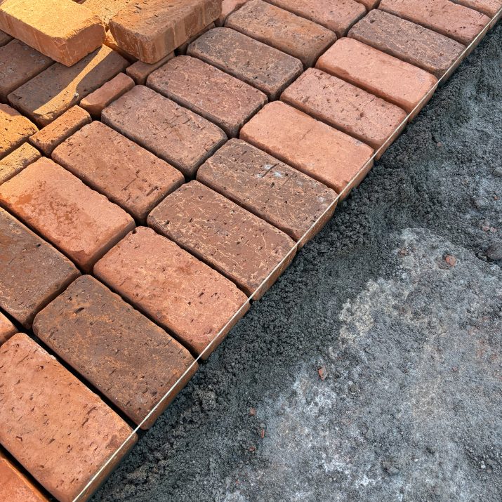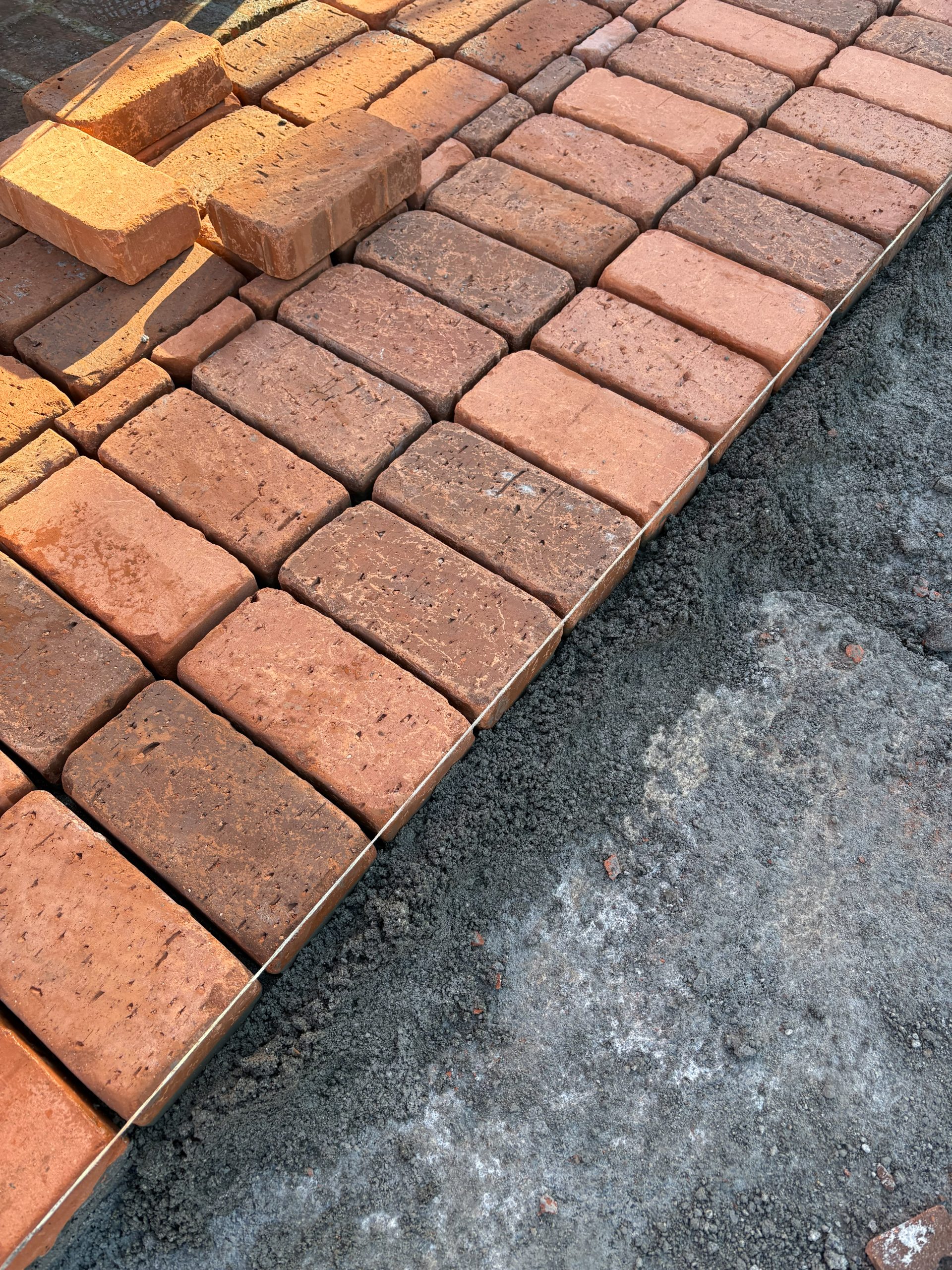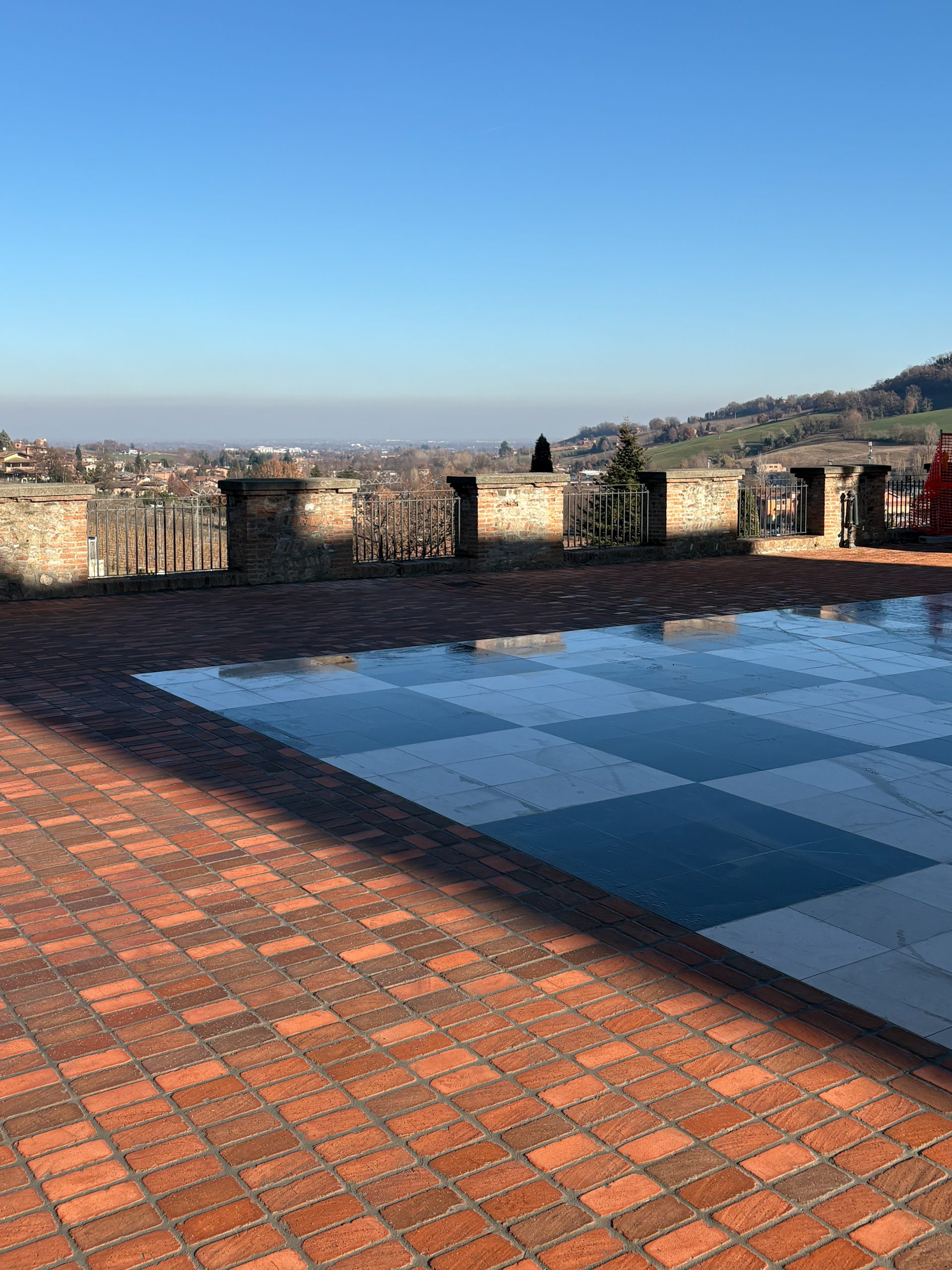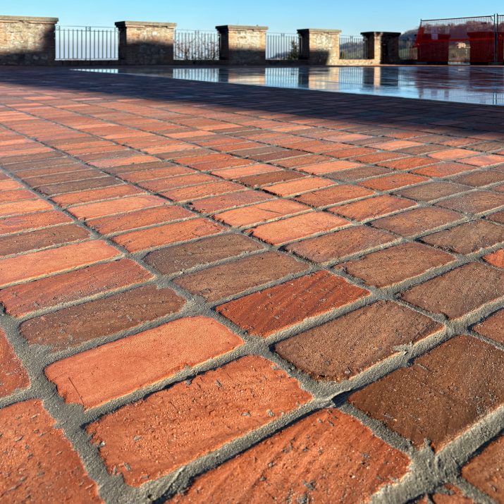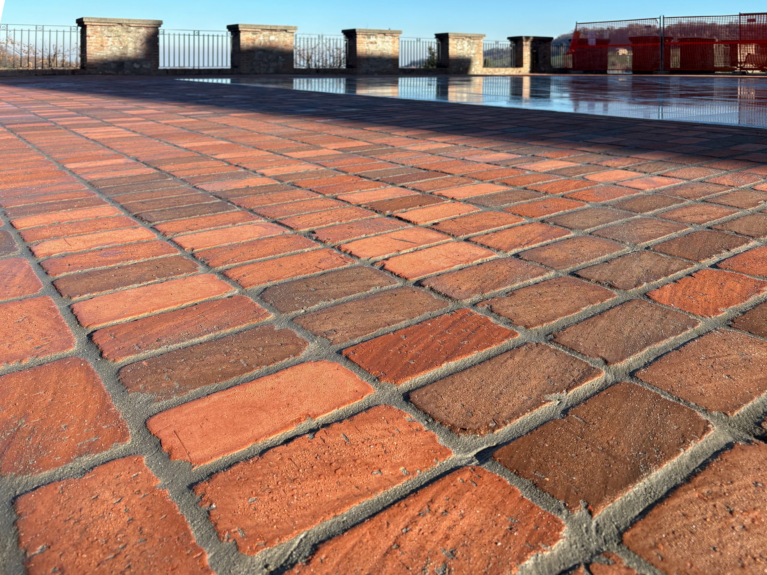 Per il progetto è stato utilizzato il nostro mattone anticato Tuscany, scelto per il suo carattere materico e per la capacità di integrarsi con l’architettura storica della piazza. Le immagini documentano alcune fasi del processo di posa della pavimentazione e il risultato finale dell’intervento, che valorizza lo spazio urbano mantenendo un linguaggio coerente con il contesto storico.